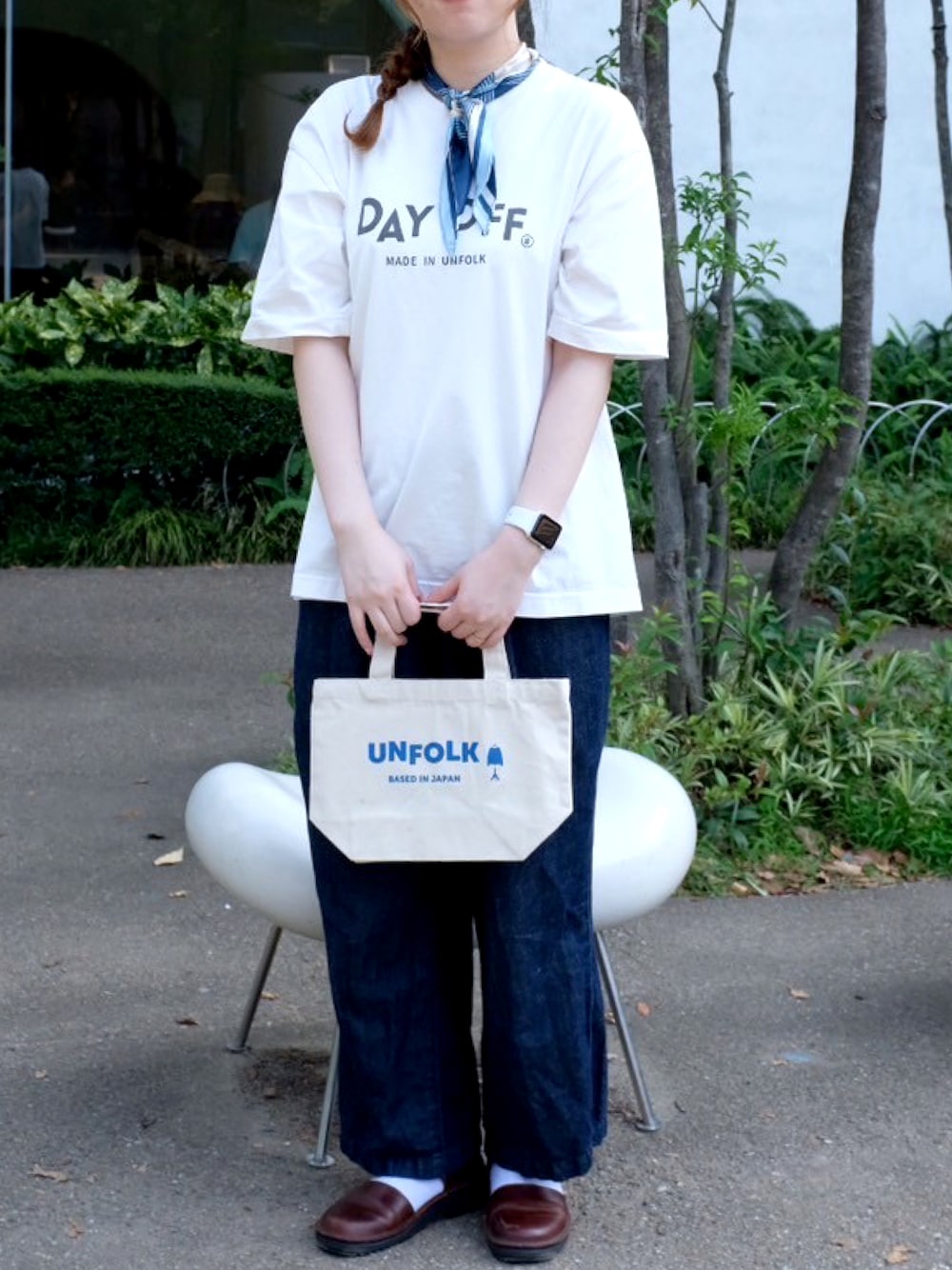 ホワイト×ブルーの王道シンプルコーデ。 ミニトートは大好きなブランド、UNFOLKのポップアップで購入特典としていただいたもの👏 無印のイージーパンツは履き心地が良く、ふらっとお出かけするときに愛用してます☺️