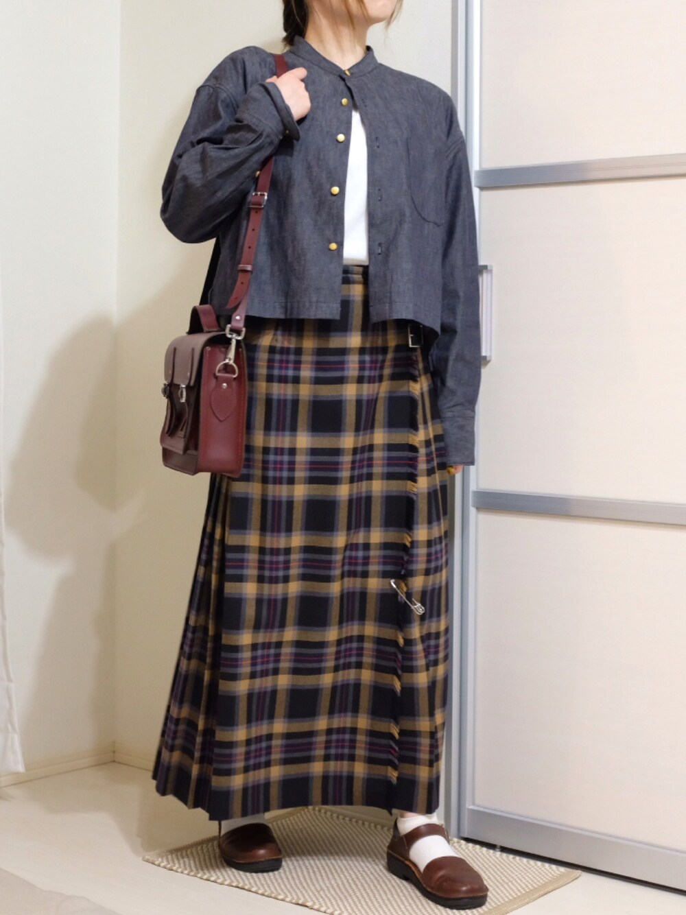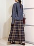 デニムシャツで抜け感を出しつつ、チェックのロングスカートでクラシカルに☕️ 深い色味のチェックとデニムが好相性◎