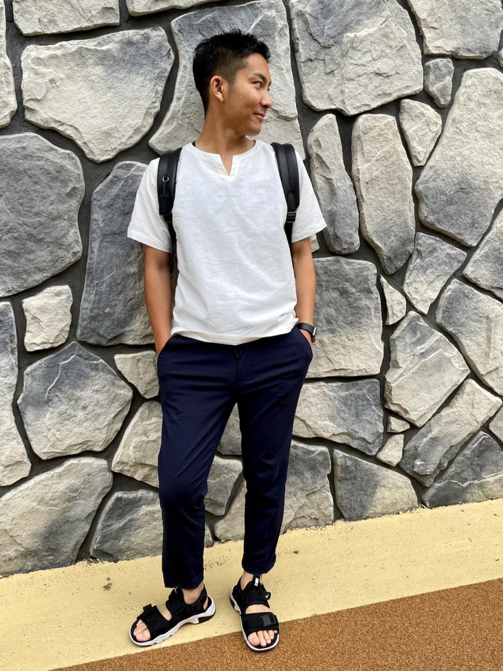 トップスとパンツはスッキリとしたシルエットで👖足首が少し見える丈感を選んでます!歩きやすいキャニオンサンダルでカジュアルに。