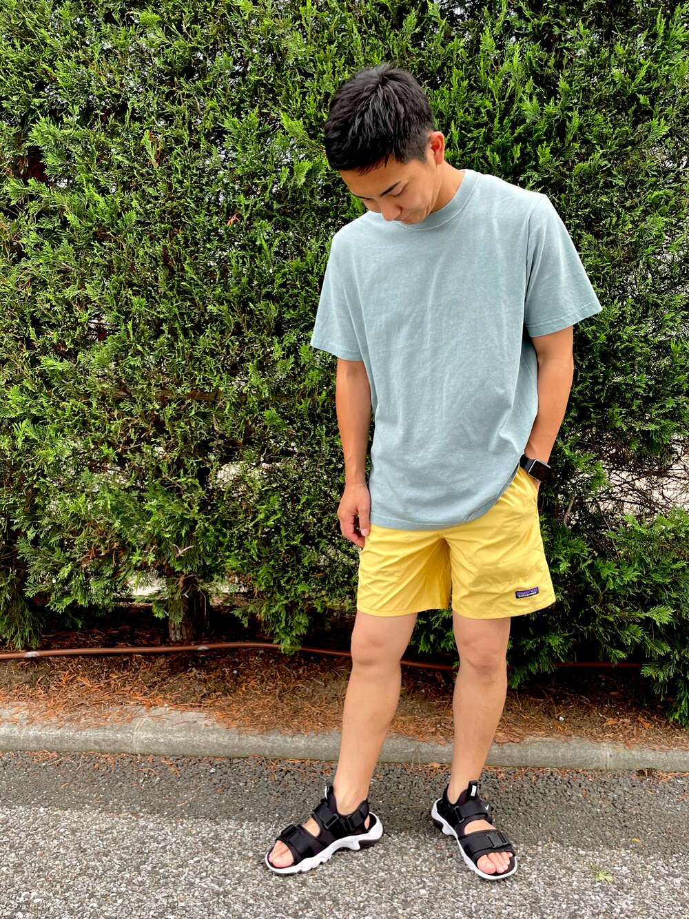 ブルー×イエローの色の掛け合わせコーデ🐬 涼しそうな色合いが夏っぽくてお気に入り🍋短パンは膝上の短めをチョイス!