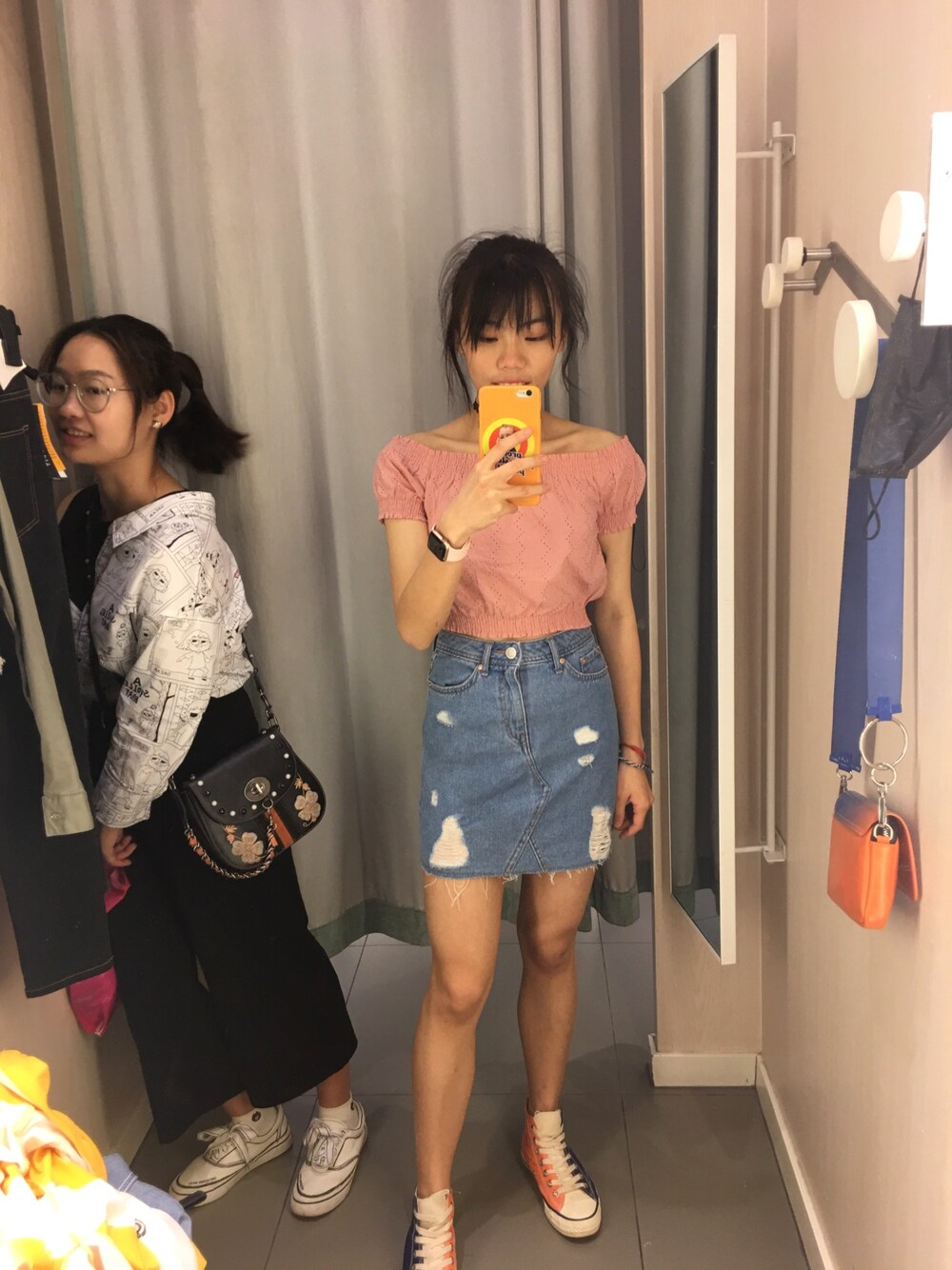 拉高腰线不显小肚子,一字肩设计很好的展现了锁骨!牛仔裙中缝拼接的线条很有设计感,整体一套显得身材比例很好👍,均来HM