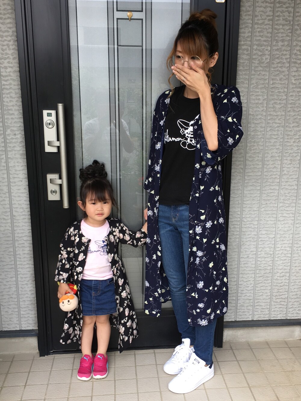 リンクコーデ👩👧💞 花柄ガウン好き〜❤ ウルトラストレッチも 履きやすくてgood👍🏻✨ 旦那が反射して写ってるのは 気にしないで〜www🙏💦💦💦