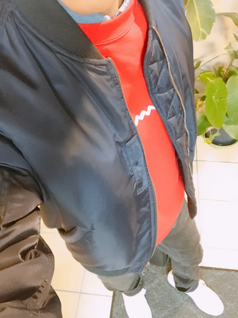 みなさんこんにちは🌂 いつもご覧いただきありがとうございます! MA_1の下は赤のChampionのスウェットシャツ!