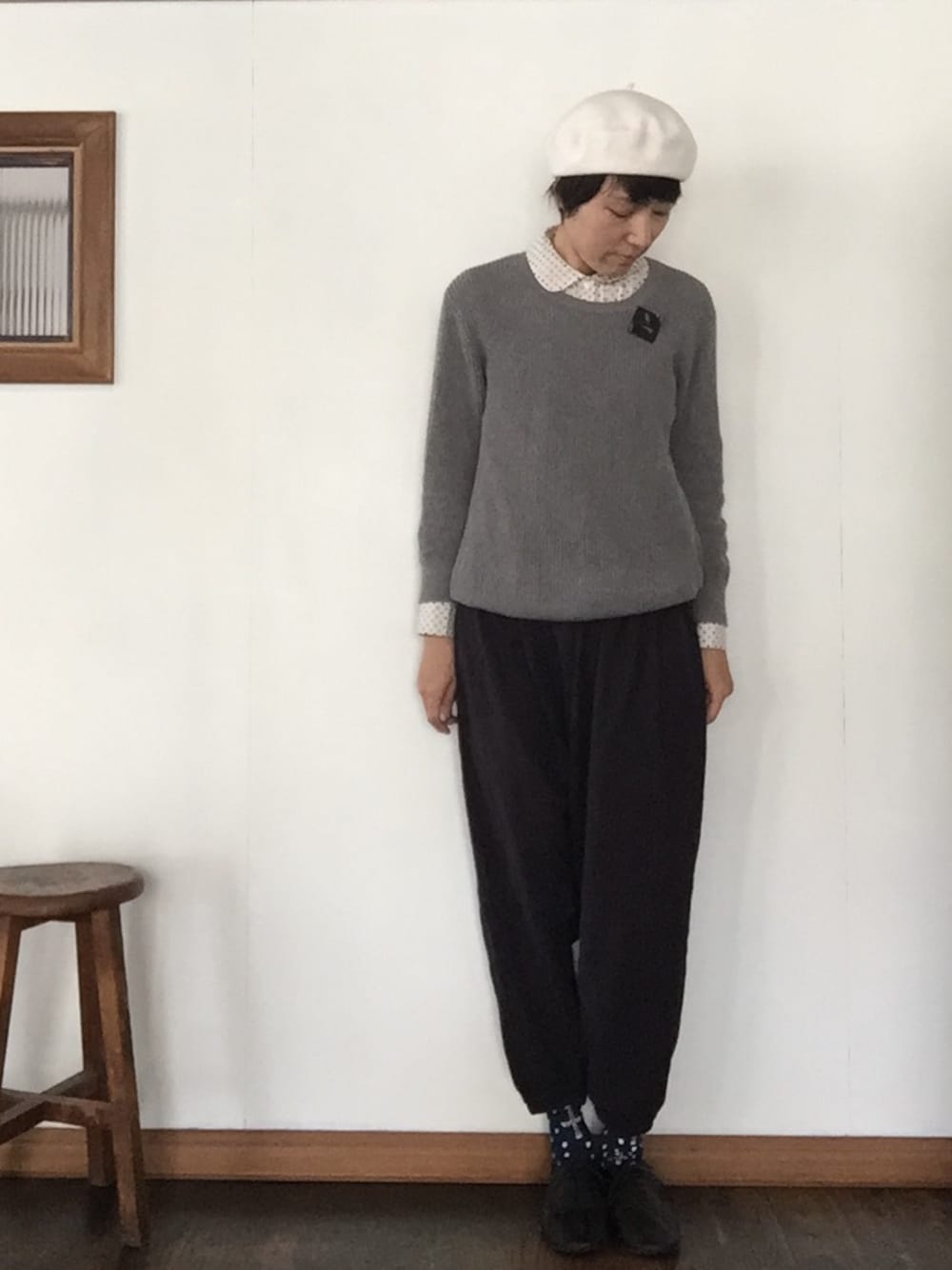 変わらないシンプル。 帽子を白にしたのと、 丸襟で、ちょっと春らしく。