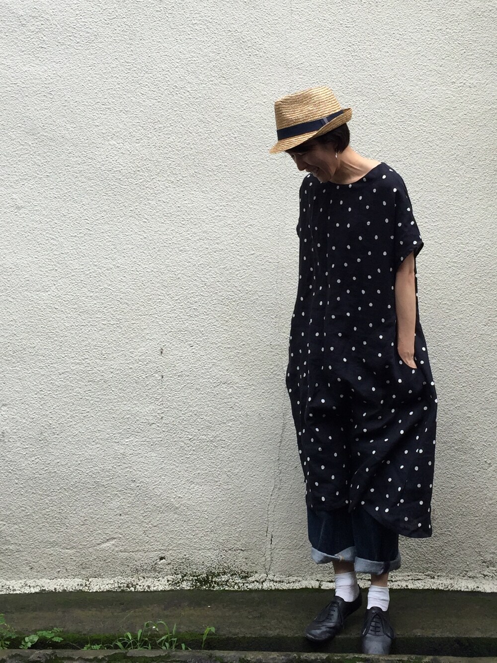 ドットのワンピース。 ラフに着るのが好き。