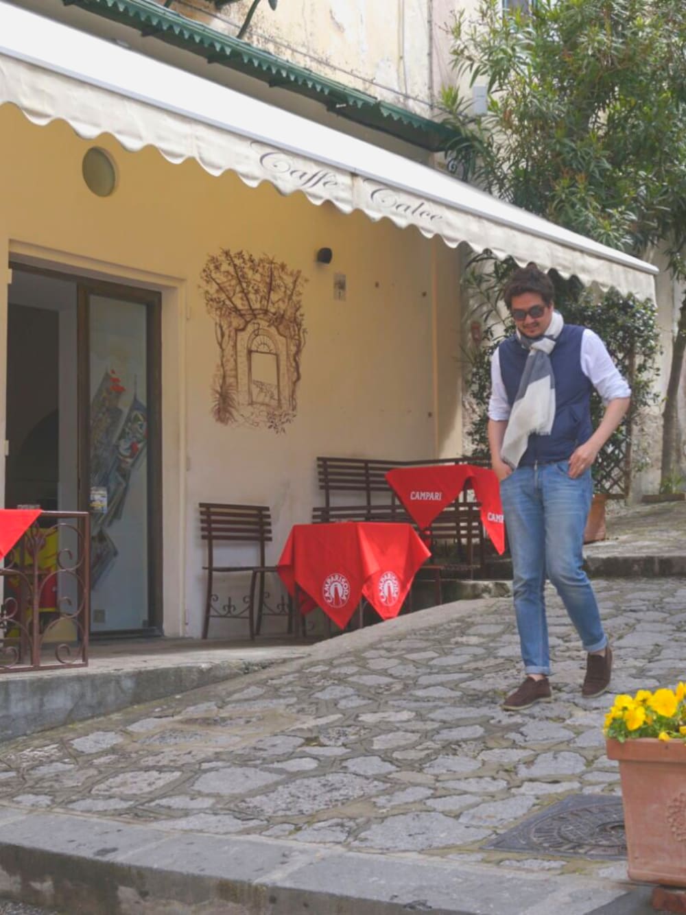 アマルフィ近くのラベッロにて。 寒かったのでベストとストールで調整。リゾートなので色目はあくまでホワイト、ブルーを中心に。