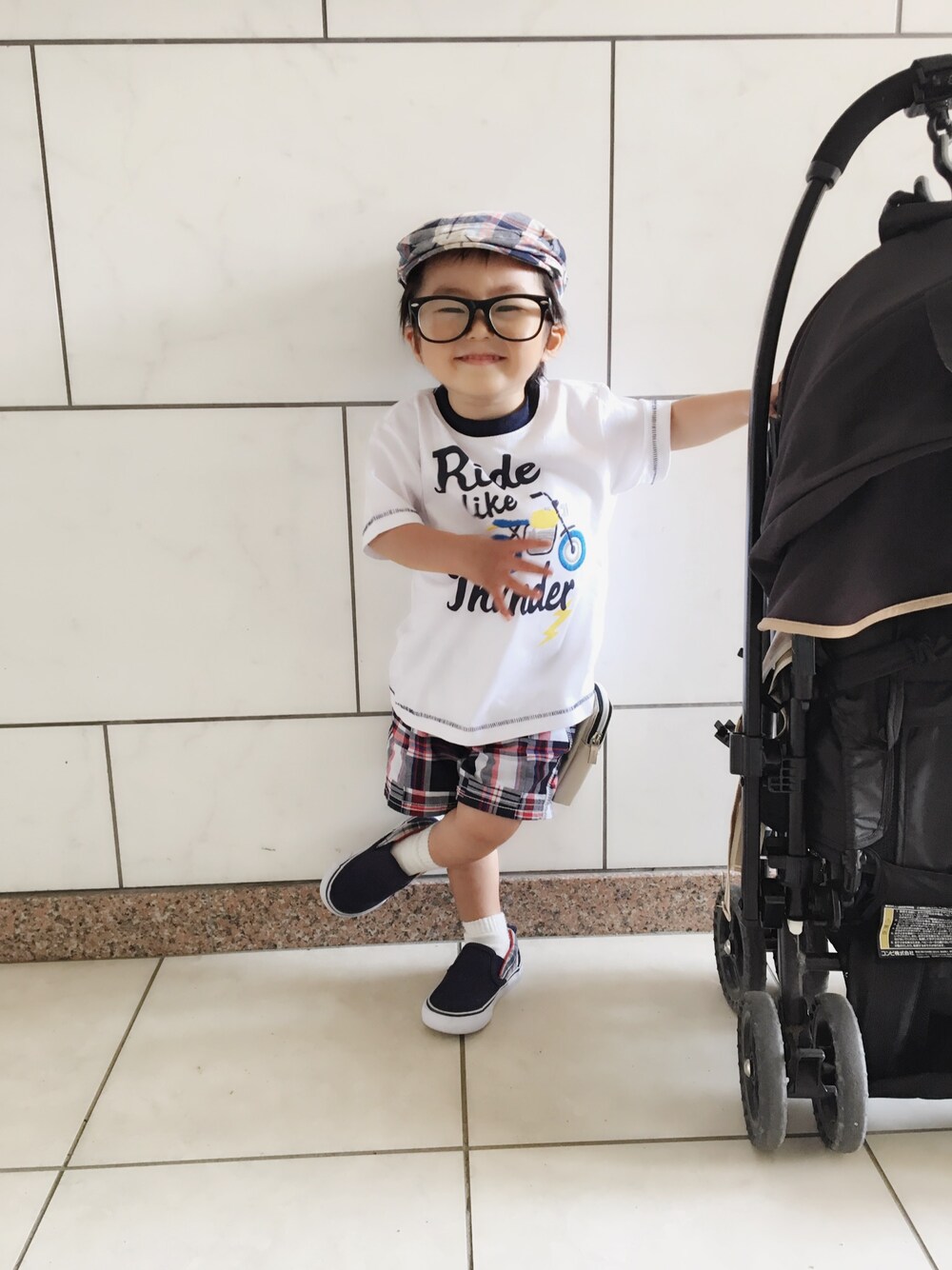 キャスケットとパンツとシューズがちょいリンク。 最近ベビーカーをやたらと押したがるから大変💦 押さなくていいから乗ってくれ😅