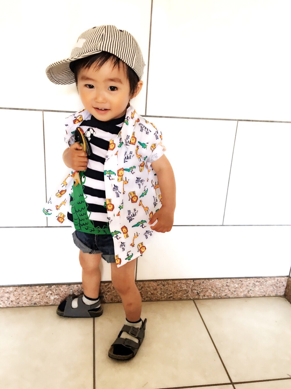 シャツもタンクトップも動物尽くしでチビはテンションMAX(笑) ちなみに手に持っているのは彼お気に入りの魚の財布😅