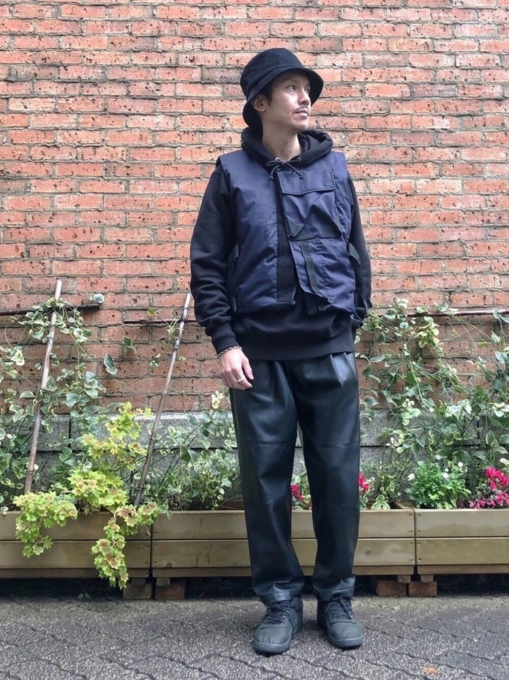 UK RAFタクティカルベストにプリマロフトを投入した見た目よりあったかベスト🙆♂️FIFTHオリジナルのリメイクアイテムを引き立てたコーデ ネイビーを引き立てる為、黒のワントーンで締めました とは言え、退屈にならないよう、 ハットの起毛したアンゴラウール、フェイクレザーパンツ、ヌバックのスニーカー異素材で作りこんでおきます ウールなどのドライな質感はナイロンやレザーなど光沢のあるアイテムと合わせると眠たくならずお勧め✍️