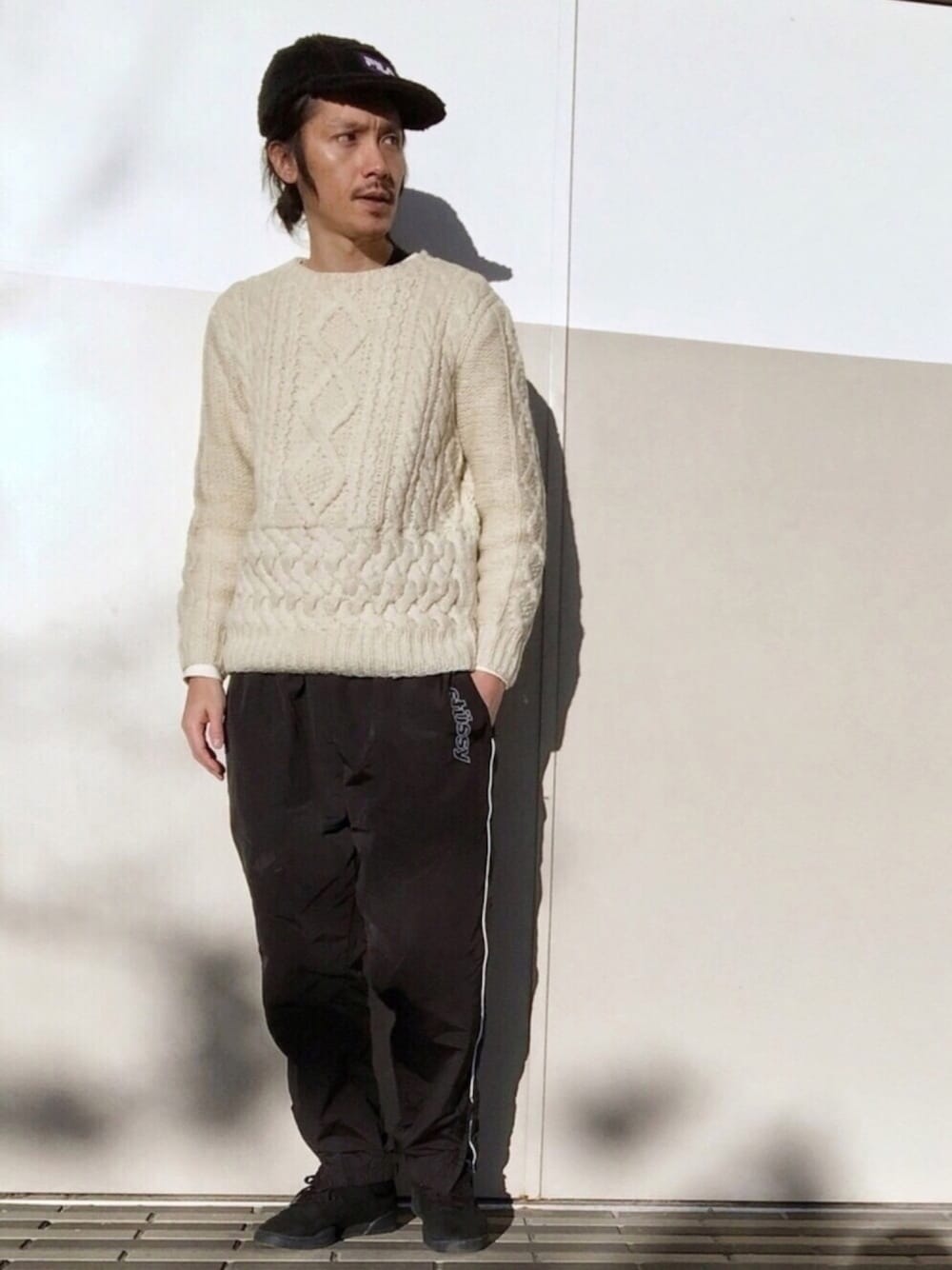 珍しく古着無し👕 90sライクなスポーツスタイルを基調に、スウェットだとまんまなので、いなためのハンドニットで強引にテイストミックス🤔