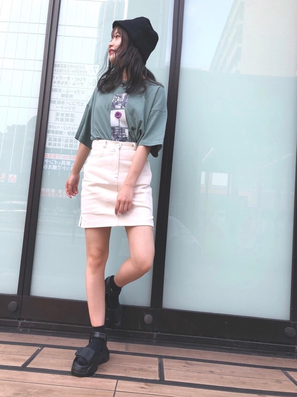 【クールなストリート風ファッション】 ブラック小物でしめた、クールなカッコいいコーデです⭐︎ フォトプリントが今年らしくてかわいいですよね♪ グリーンと白の組み合わせも、くすみグリーンならカッコいいイメージで着れちゃいます😊 黒のバケットハットを被るだけで、一気にストリートコーデぽくなれちゃうので、気分転換できちゃいます😎