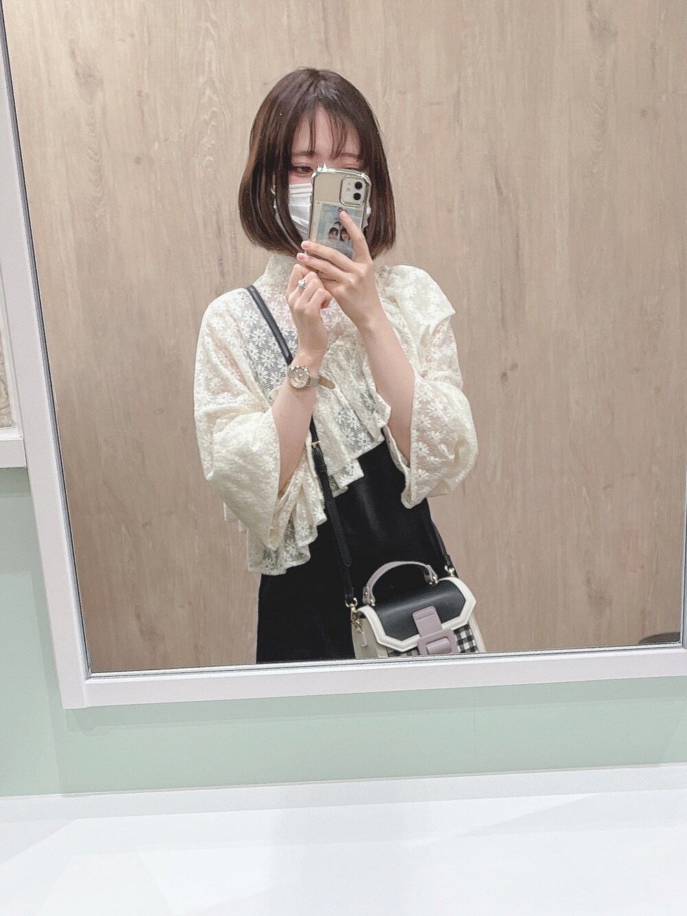 1年前のガーリーコーデ🎀🤍 メリージェニーのボレロ?っぽいのと、グレイルのミニ丈のシアーシャツがついたワンピースのワンピースだけで合わせてみた。バッグをギンガムチェックの可愛らしいバッグと合わせたからより可愛い。 ボブ懐かしいな。またボブにしたいな〜。