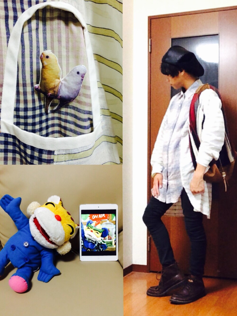 みなさんお久しぶりです♪ ニャンちゅうです( ^ω^ ) 2週間振りにUPしまーすっ! もうすぐ秋ですね(OvO✳︎) とゆう事で♪今回から秋っぽく仕上げてみましたっ 先ずはYEAH!RIGHTのロングシャツ! チェック柄とボーダーが一つのシャツに 入ってて、左胸にはセキセイインコのアイテムがついてます(^ν^✳︎) めっちゃ可愛いすぎて即買いしちゃいましたw 次にT•K GARMENT SUPPLYのトートバッグ♪ 2年前に購入したアイテムで久しぶりに使用しましたww 紐の先にはなんと!!鹿の角が付いてます♪ 柄も秋っぽくて可愛いですヾ(@⌒ー⌒@)ノ Paul Smithの茶色ブーツでさらに秋秋しくして♪♪ 最後に黒のスキニーとベレー帽で全体を引き締めてとっっ笑 完成(✳︎´∪`✳︎) 相方と一緒にiPadで検索してたら、面白い画像があったので同じポージングをさせましたww あれ?やけに顔が黄色いぞ、、、、、、、、、、笑