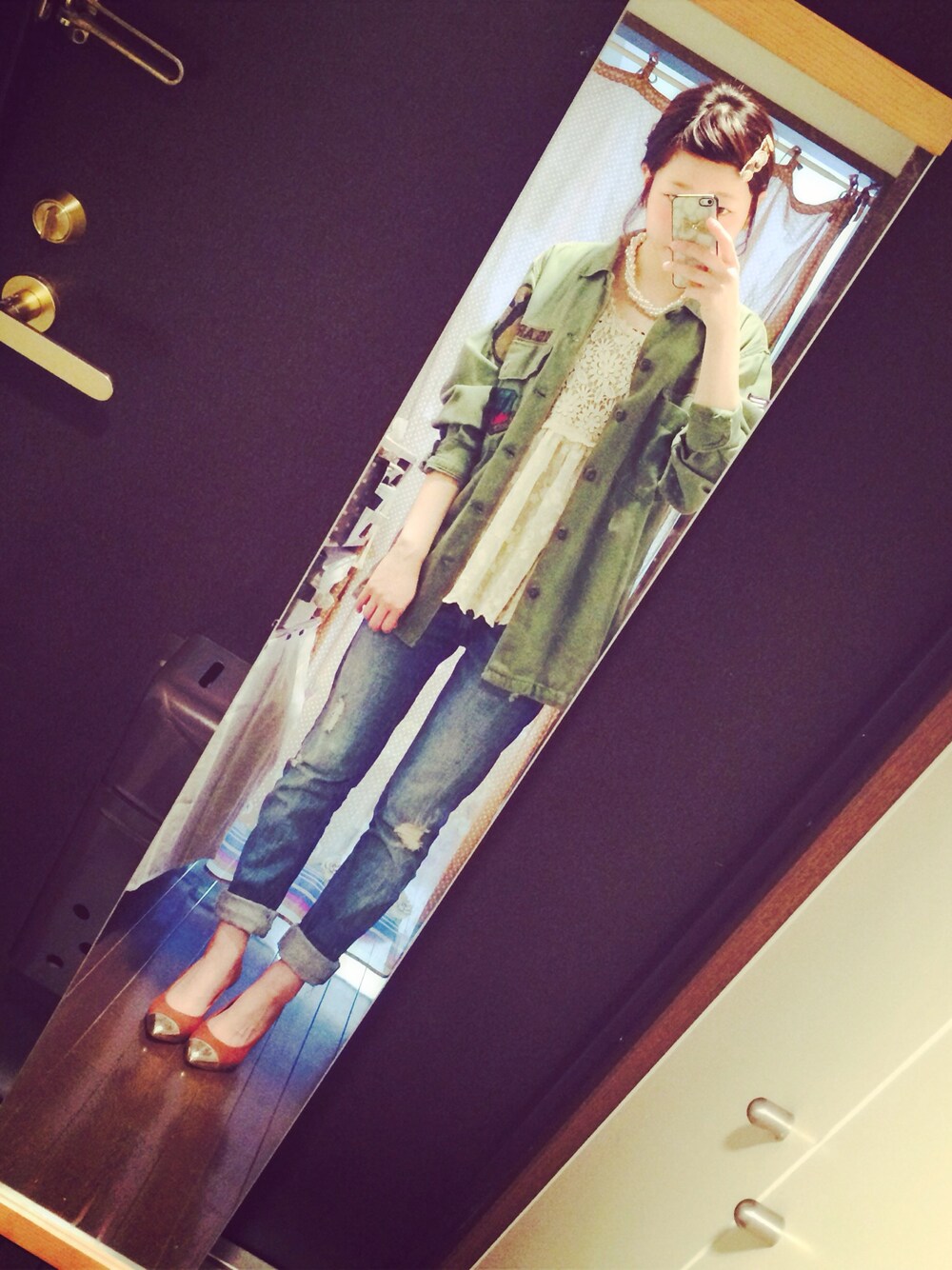 ミリタリーシャツ used トップス INGNI デニムパンツ ZARA ヒールパンプス KBF アクセサリー LOWRYSFARM