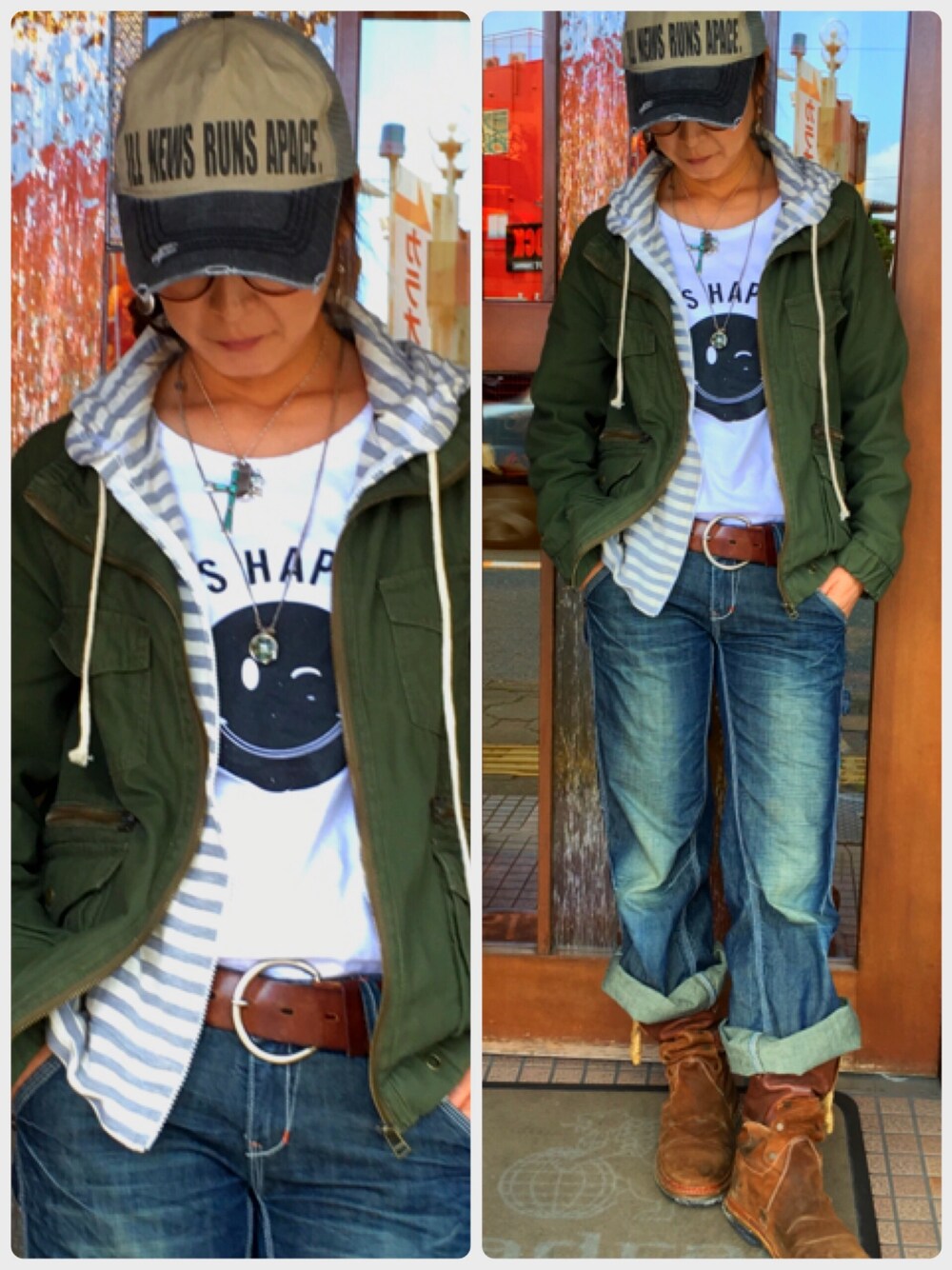 今日は男の子チックにしました♪楽ちんやし動きやすい!インナーは大好きなsmileのTシャツ♪ デニムはもう8年は愛用している!気に入りすぎてもう1本買えば良かった〜 今日は寒いから重ね着しまくりです!