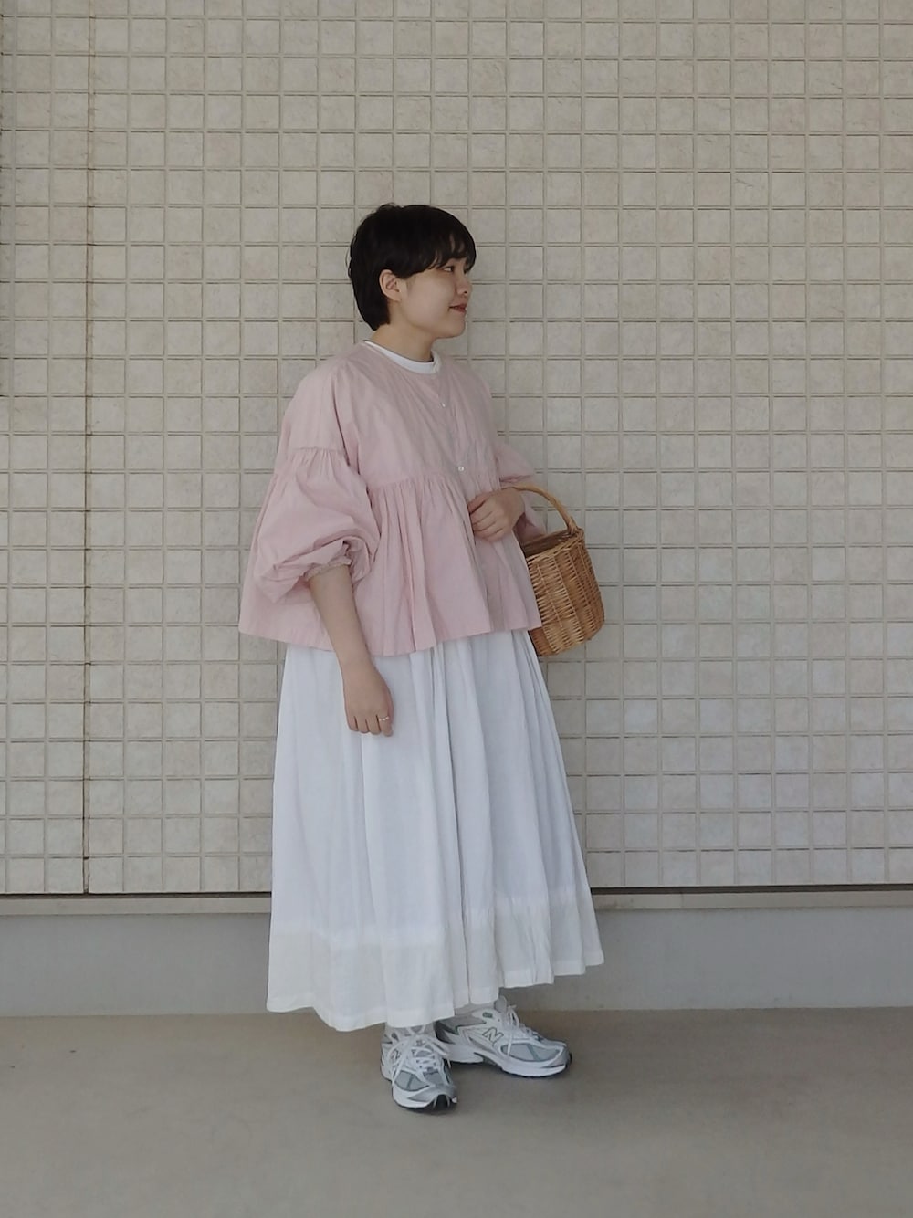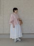 ベージュ系のかごバッグ、ピンク系のシャツ/ブラウスを着用したレディースの春コーディネートの2枚目の写真