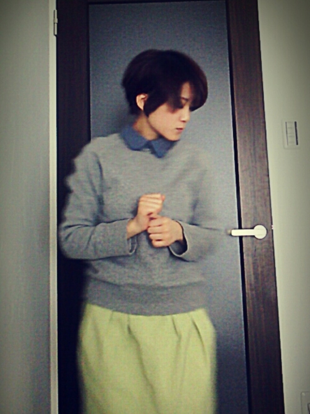 雪が積もったけど、気分だけは春! スウェット:beauty&youth united arrows 中に着たシャツ風カットソー:LIBRE MAISON スカート:Ray Cassin