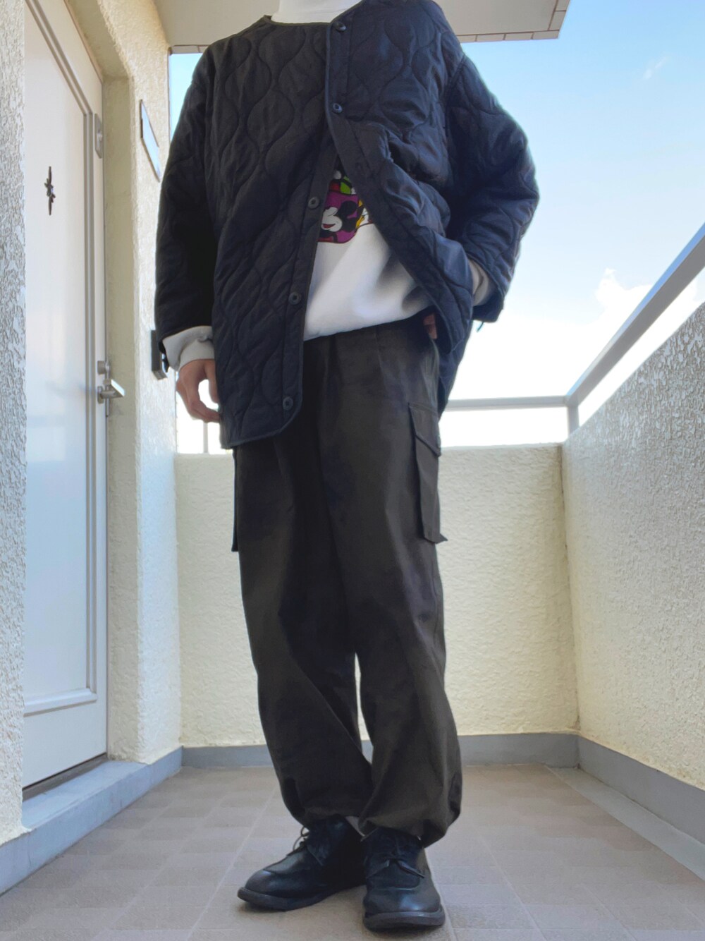 【キルティングコーデ】 年内フォロワー1000人目指してます!! いいねと一緒にフォロー貰えると励みになります! フリークスストアのモッズコートのライナーをコーデに使いました! 全体的にミリタリー、古着っぽくまとめました! ミリタリーパンツとキルティングの相性はバッチリです◎ また、ミッキーのスウェットを入れて遊び心をコーデに組み込みました!