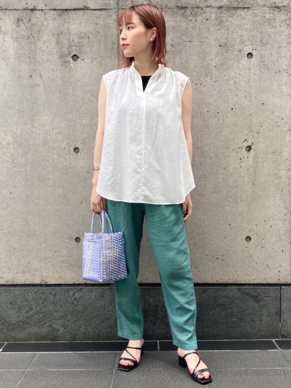 【身長 162cm】 襟元のデザインがポイントのブラウスに、カジュアルなテーパードパンツを合わせました◎パンツはカラーものを選ぶと今年らしくなります。