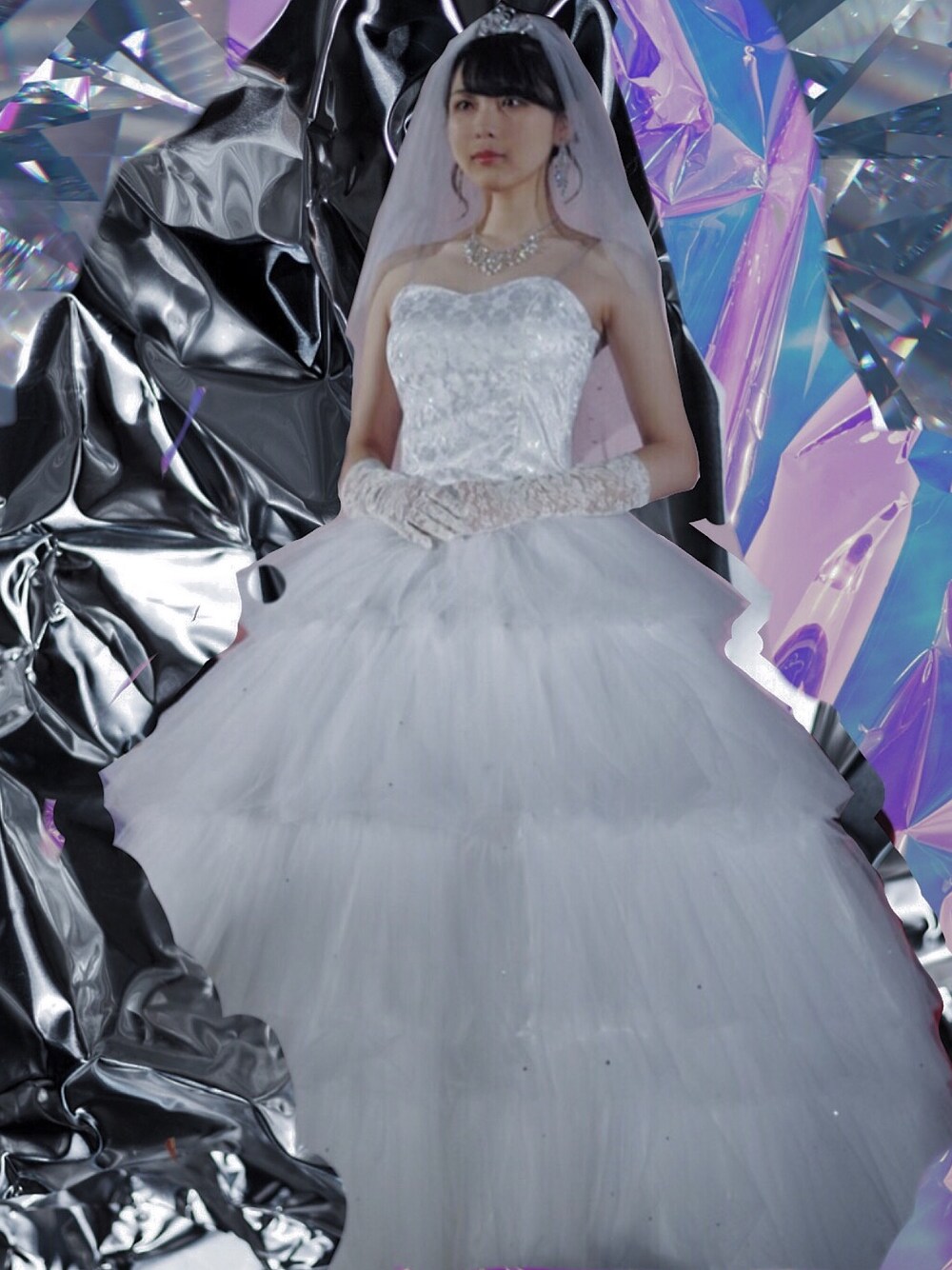 6段フリル、1段各50メートルのソフトチュールを使用。 ビスチェはウエディングサテンにラメ箔刺繍のレースを重ね、バックは編み上げリボン仕様。 スカート裾に向かいスワロフスキーを散りばめ、動く度に光を集めて輝く 型紙制作から完全自作のウエディングドレス👗