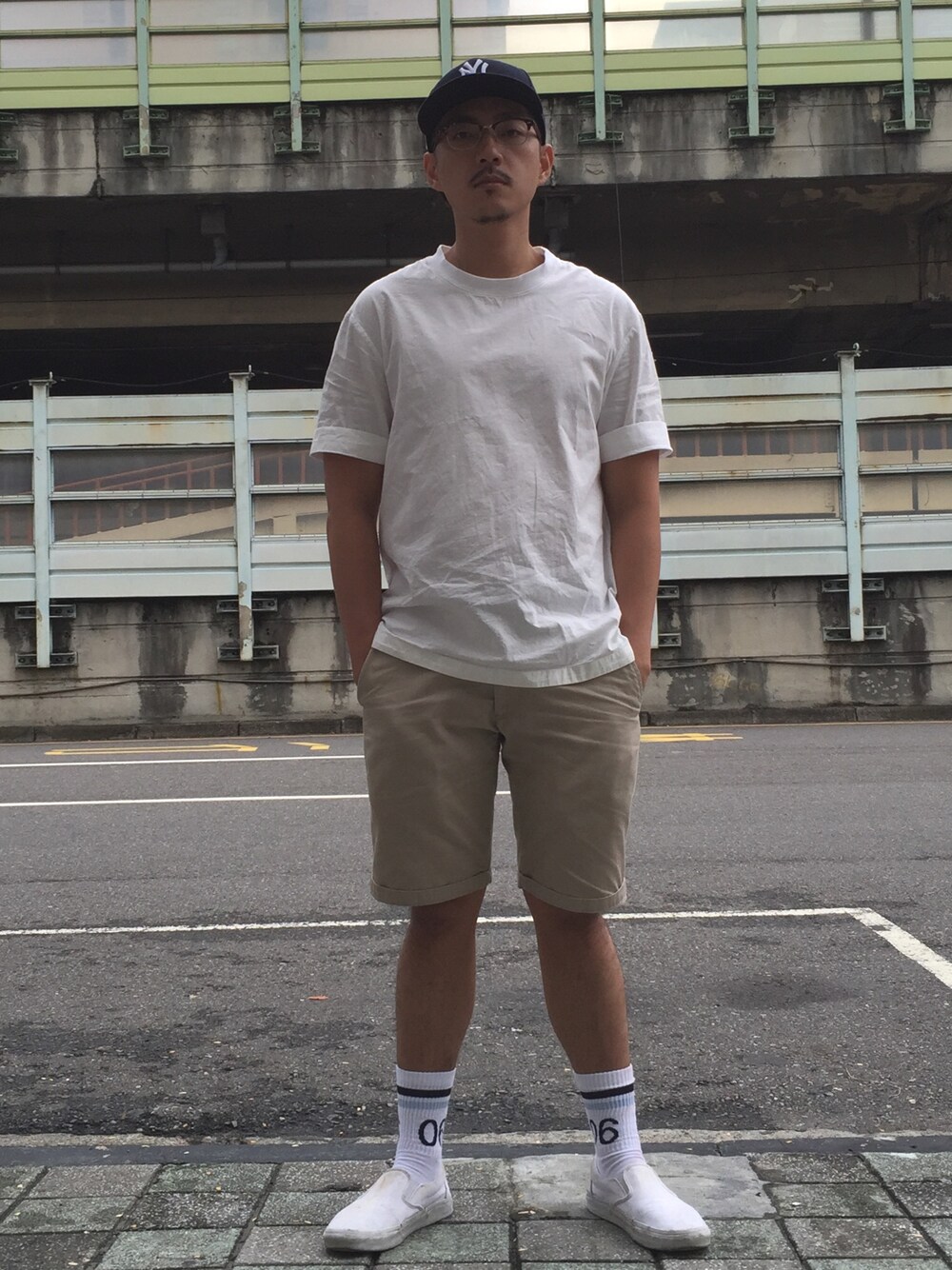 ホワイト系のTシャツ/カットソー、ベージュ系のカーゴパンツ、ホワイト系のスニーカーを着用したメンズの夏コーディネートの1枚目の写真