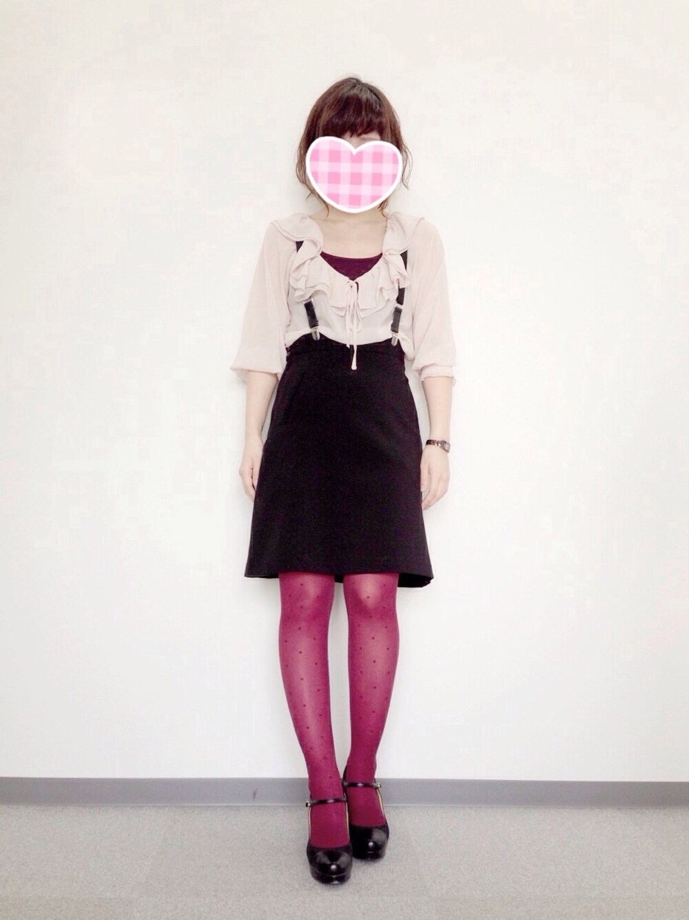 ★今日のカラー★ ラズベリーピンク×クロ×モスピンク ★アイテム★ トップス →パラビオン スカート →H&M サスペンダー →雑誌の付録 タイツ →タビオ(ドットと無地の重ね履き)