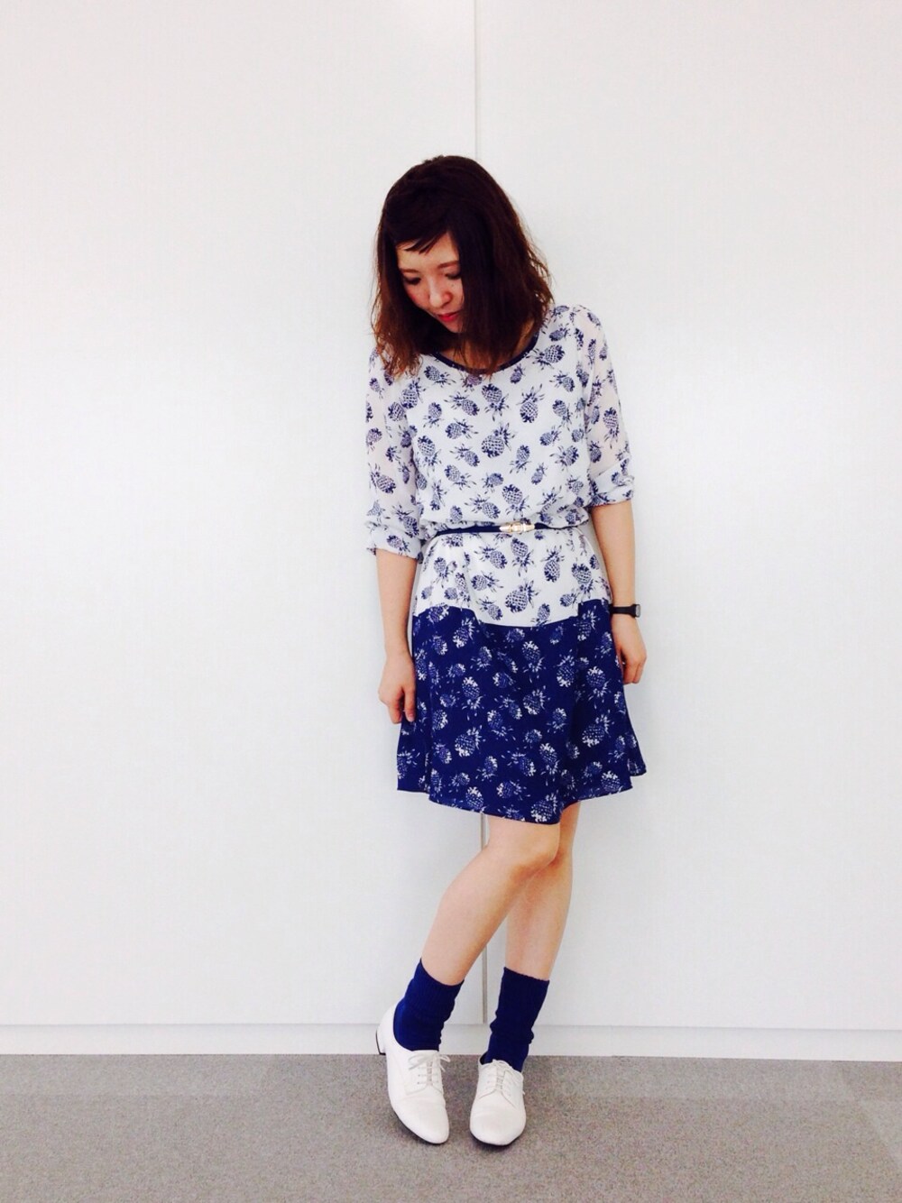 ★ワンピース ELLE ★ベルト AG by aquagirl ★ソックス 靴下屋 ★シューズ vis パッと見て昆虫柄にも見えそうですが、 パイナップル柄のワンピースです。 シルエットが大きくなり過ぎる時には よくベルトを使います。 ソックスは、今回の様に伸ばしてはくと 程よいボリュームがでる厚みと柔らかさがあります。なのでカジュアルファッション向け。 そのボリュームから、三つ折りにして履くと 足首が細く見えるので、ヘビロテアイテムです♪