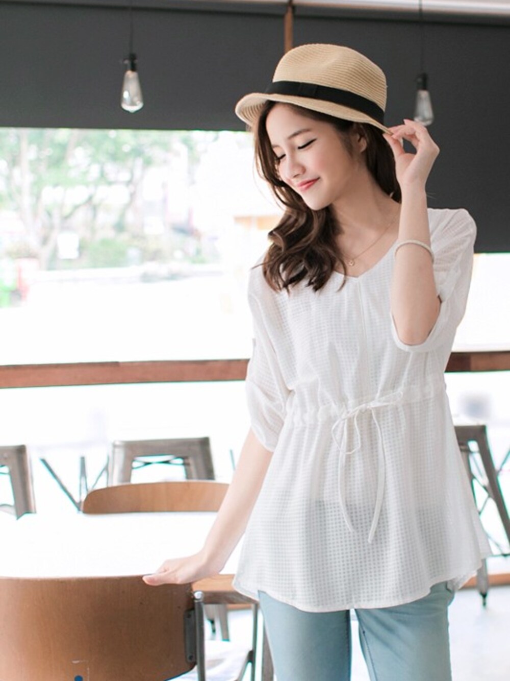 OB嚴選のその他トップス「V領露背腰抽繩格紋上衣」を使ったコーディネート