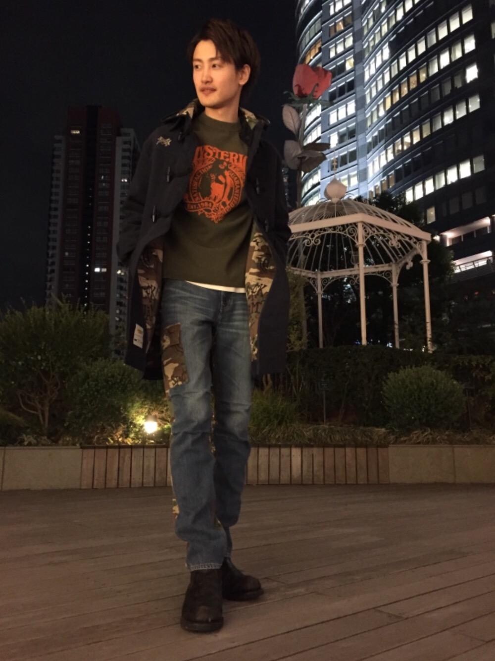 モンゴメリーダッフルコートの裏地とデニムに施してある柄を合わせたコーデです!