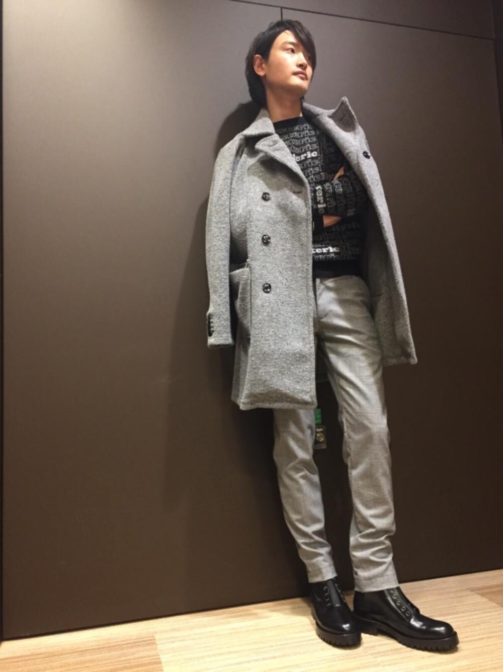 黒とグレーでまとめたモノトーンコーデです! スラックスやブーツに施されたジップがカッコいいです! Pコートはパイル生地の春仕様になっています!