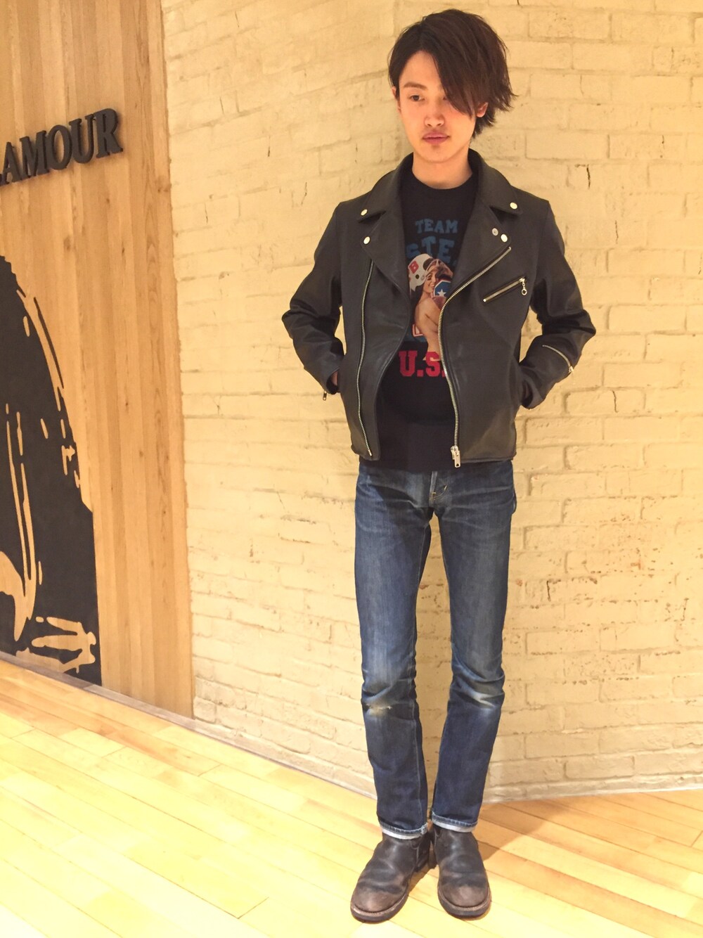 obi(HYSTERIC GLAMOUR銀座マロニエゲート店)のライダースジャケット「キップレザーダブルライダースジャケット」を使ったコーディネート