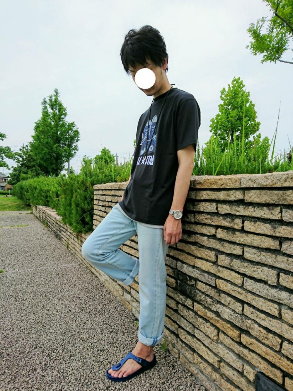 ビルケンのサンダル買いました! GUの淡い色のデニムと良く合います! 見えにくいですが、 Tシャツにはオールスターが プリントされています!