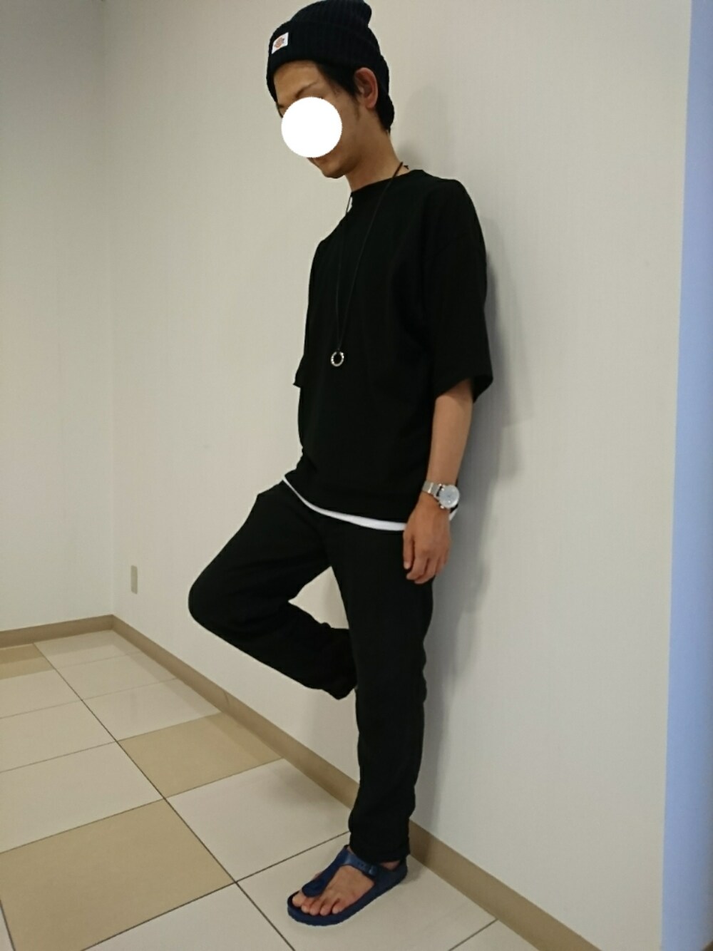 ブラックコーデです! ブルーのニット帽とサンダルを 差し色にしたつもりですが… 暗くて良くわからないですね(笑) ニット帽は 暑かったです…