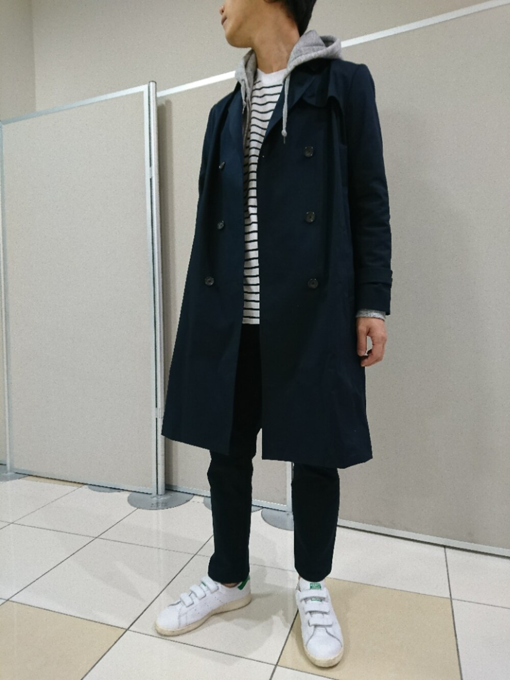 トレンチコート買いました! ユニクロのWOMEN'S XLです! サイズ感最高です! トレンチのインナーに ボーダー × パーカー ずっとやりたかったコーデです!