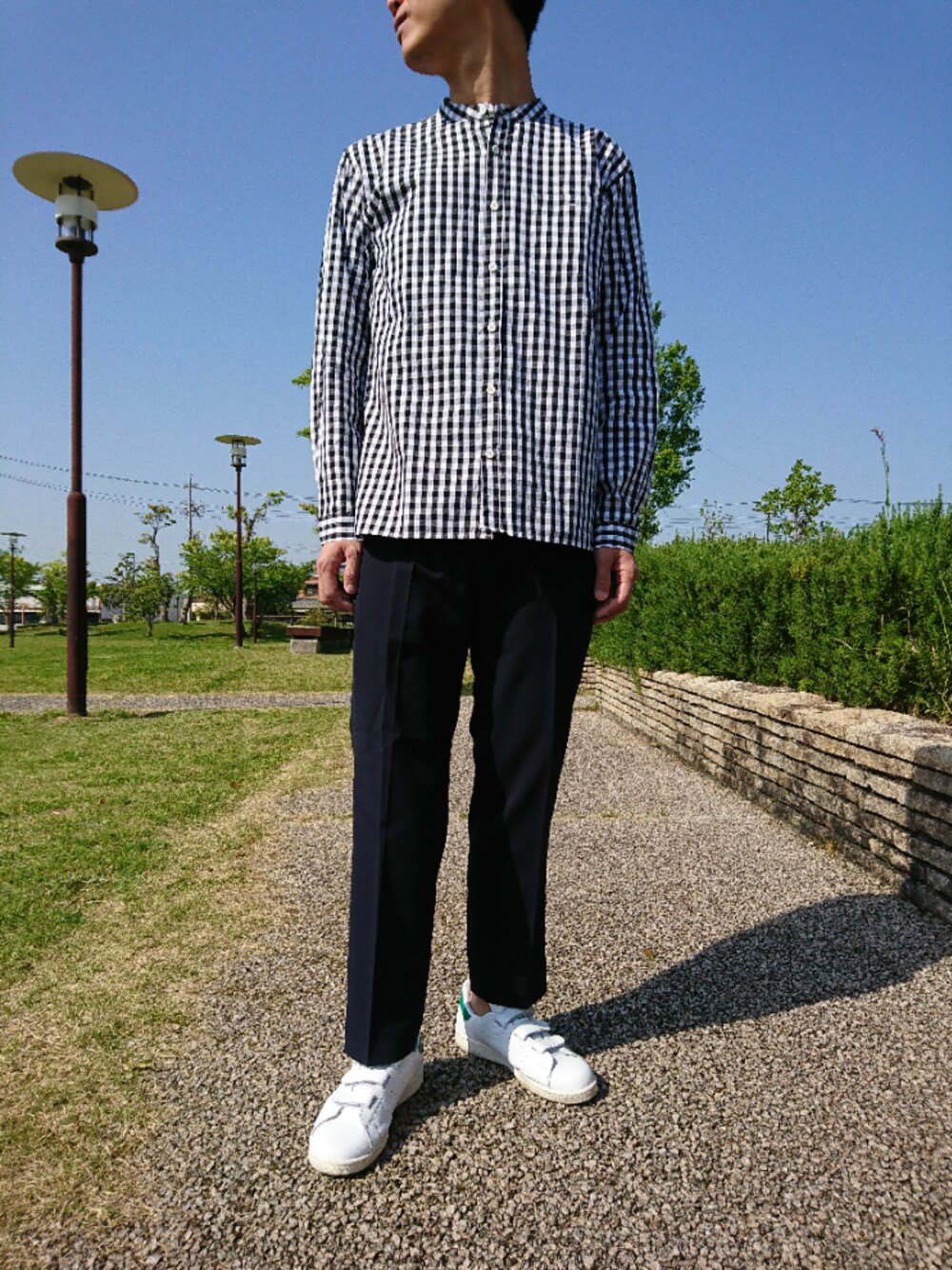 ゆったりめ休日コーデ! バンドカラーシャツ × スラックス × スタンスミス! バンドカラーのギンガムチェックシャツ お気に入りです!