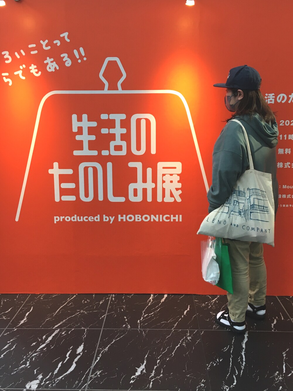 ホワイト系のトートバッグ、ブルー系のパーカー、ブラック系のサンダルを着用したレディースの春コーディネートの1枚目の写真