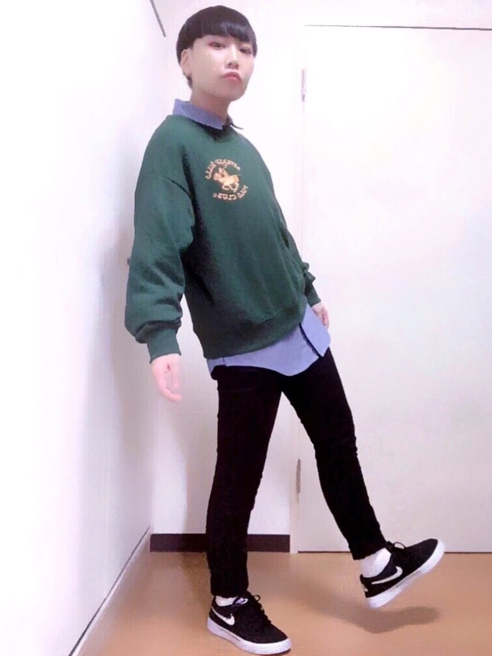 丈が長めのドレスシャツに古着のスウェット ボトムはスッキリと シャツは形態安定シャツなのでぜんっぜんシワにならなくて肌触りも最高に気持ちいいです! 靴下ちょい見せできるようロールアップしてます。 自分はこのスタイルがすごい好きですね~ 今日は真面目か(笑)