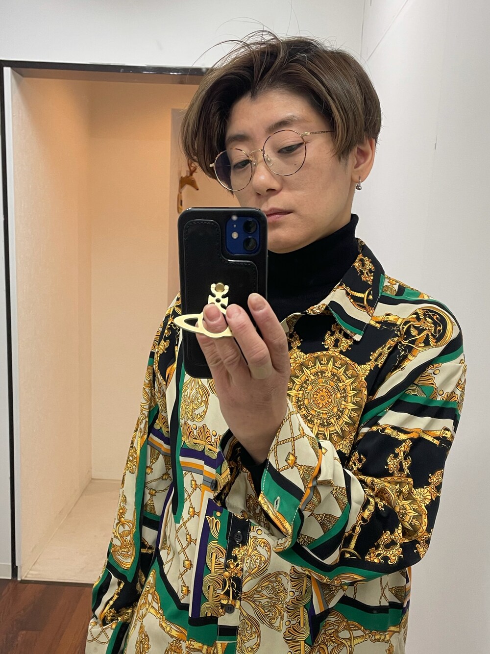 ショートだとタートルネックがいい! シャツは派手めのレトロ柄