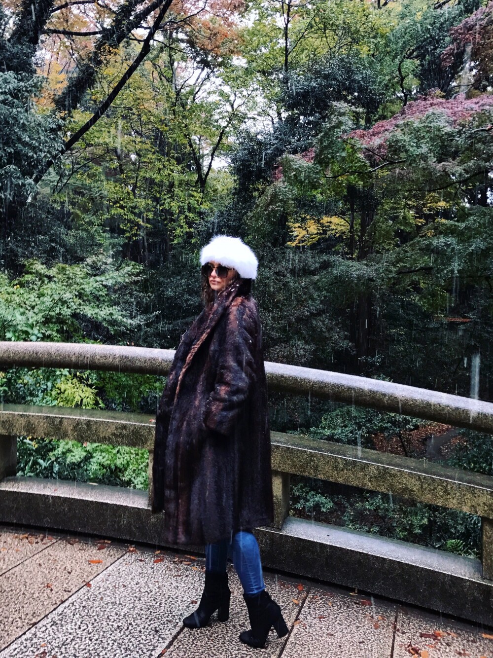 ブラウン系のダウンジャケット/コート、ホワイト系の帽子を着用したレディースの秋コーディネートの1枚目の写真