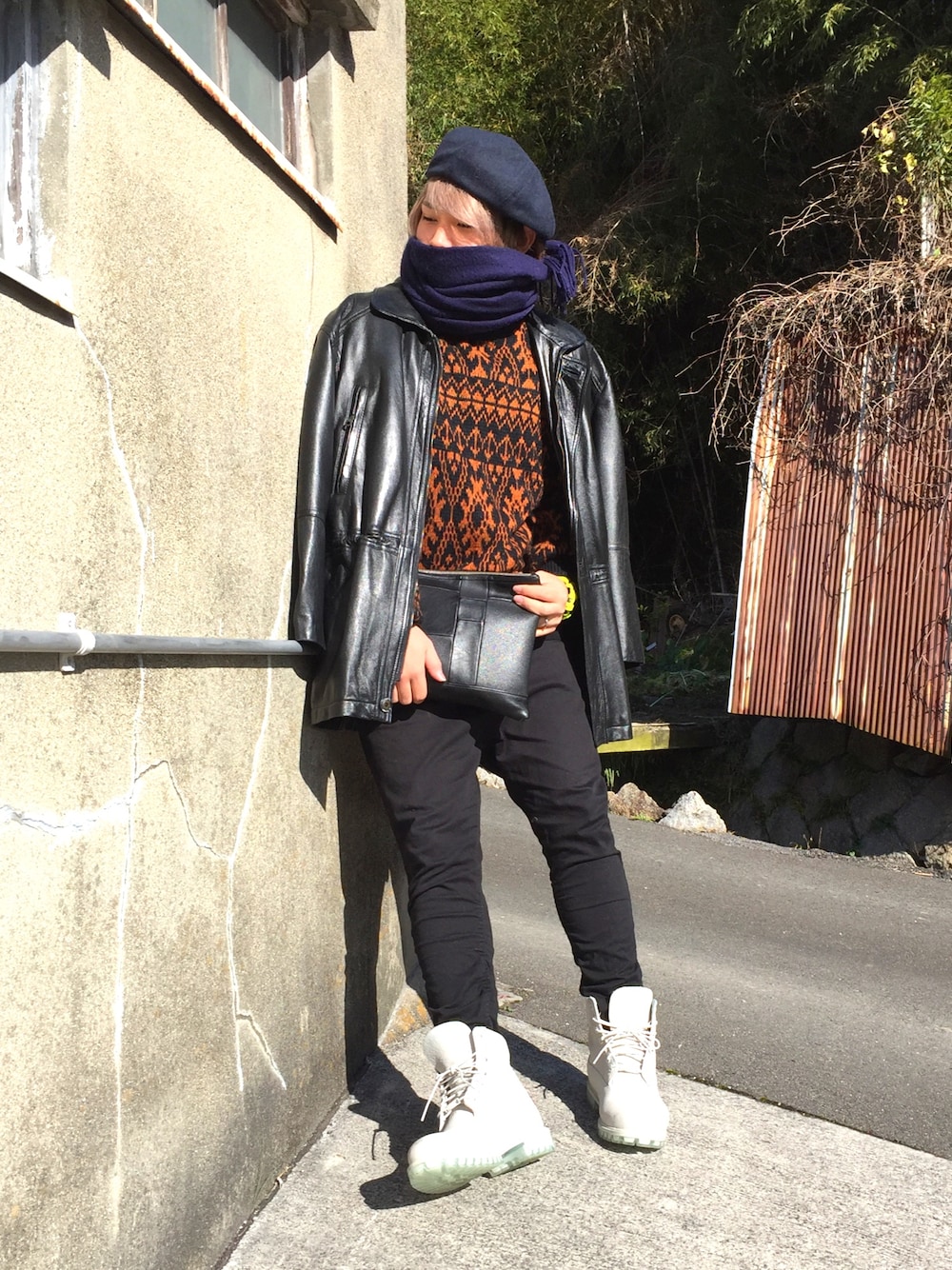 肩掛けのアウターはめちゃめちゃでかいレザーのコート😏 デカめのシルエットに下は細身のスキニーでバランスよく仕上げました✌ そして最近お気に入りのグレーのティンバ😎 ティンバともマッチして最高に暖かいレザーのコート👍 古着は最高ですね😏👈