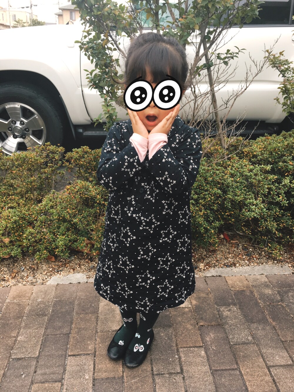 アニエスのワンピース 近くで見ると小さい花柄、遠目で見ると星の形に☆気に入りすぎてサイズアウトギリまで着させる。袖丈が微妙に足りなくてインナーのUNIQLOプリキュアヒートテックががっつり見てえてる。やだー。