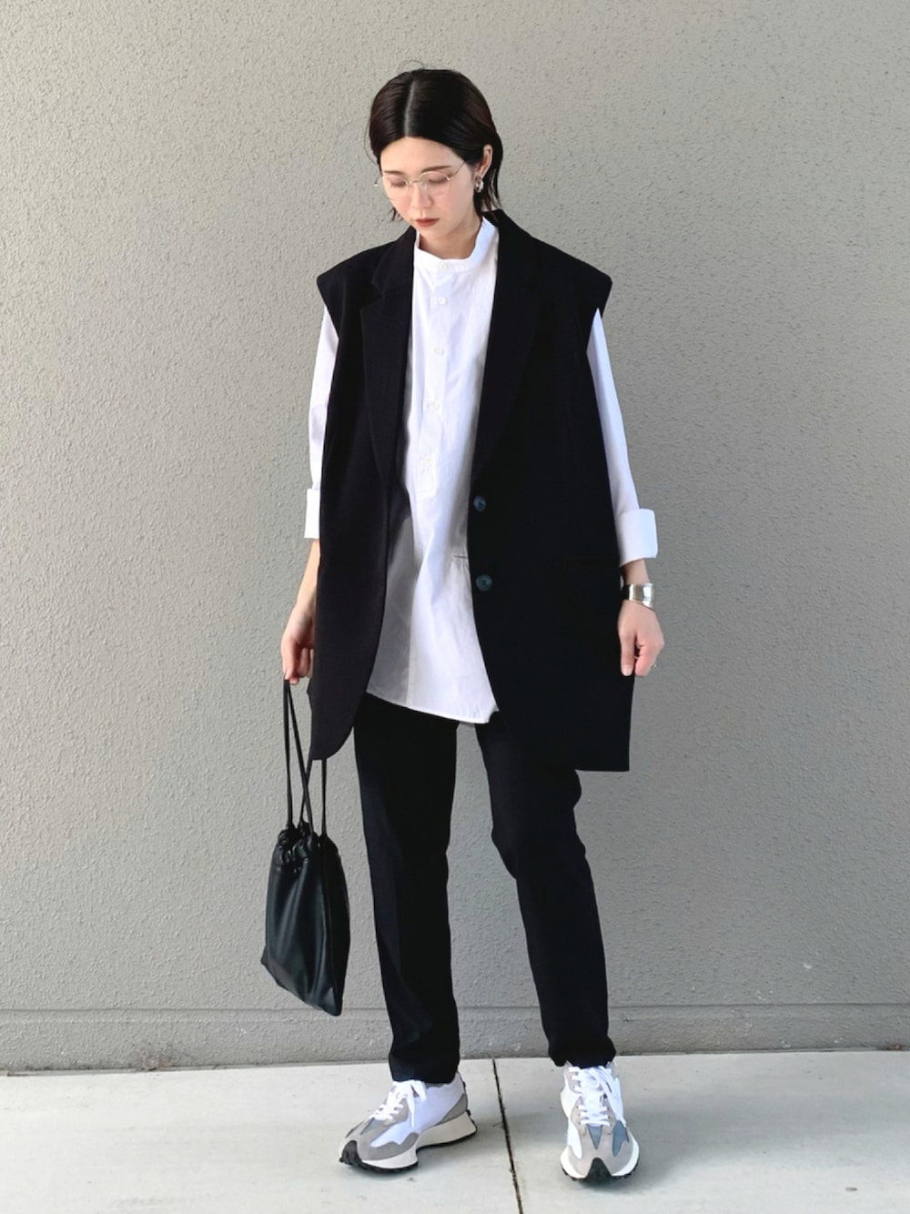 ご覧いただきありがとうございます♡ 今日はH&Mのベストとパンツで セットアップ風☺️ 最近モノトーンにハマってます🖤