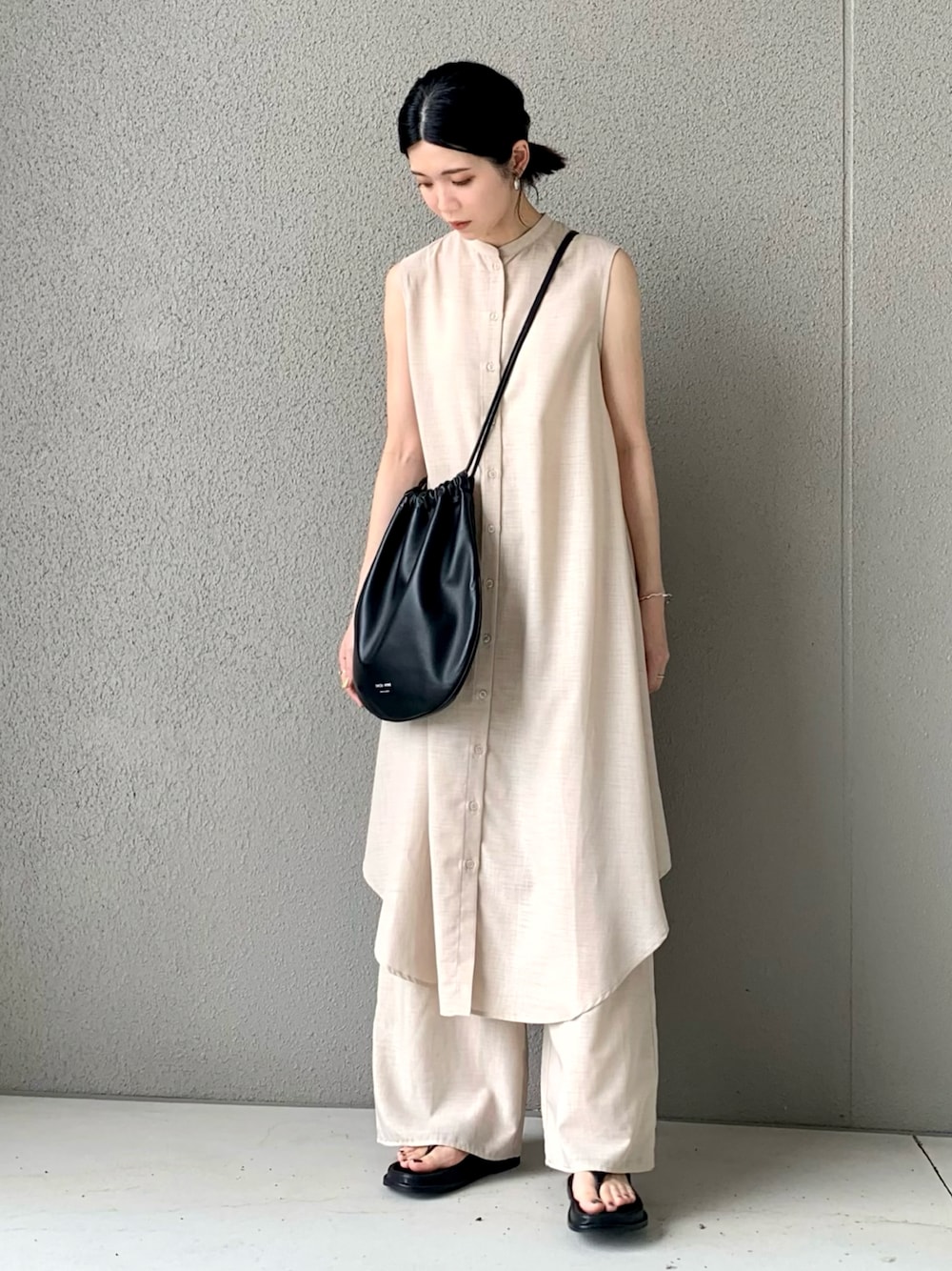 OKIRIのワンピース「スラブノースリーブバンドカラーマキシ丈ワンピース」を使ったコーディネート