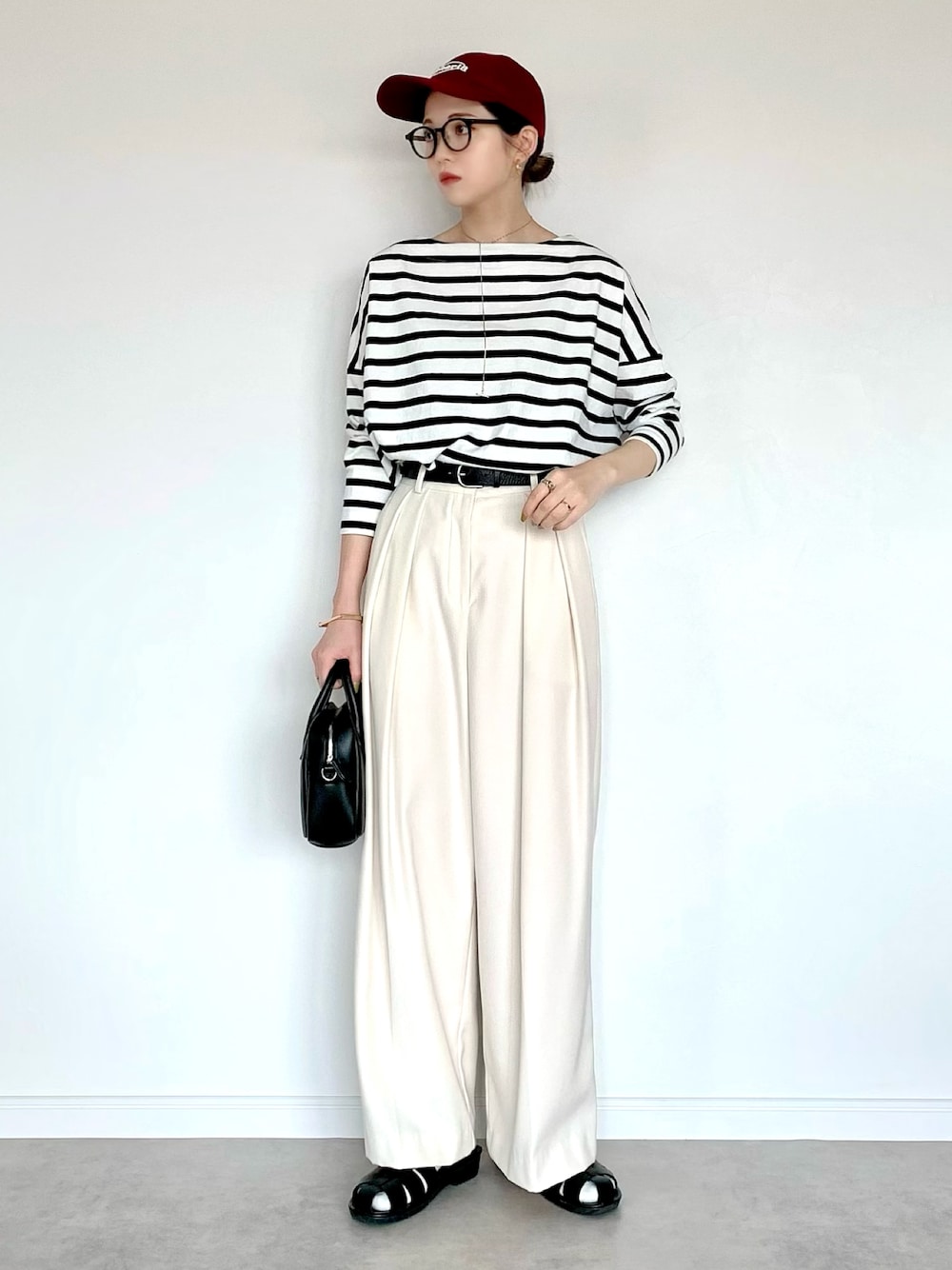 ご覧いただきありがとうございます♡ ホワイトのキレイめタックパンツに ボーダーとキャップ合わせた カジュアルコーデ🤠