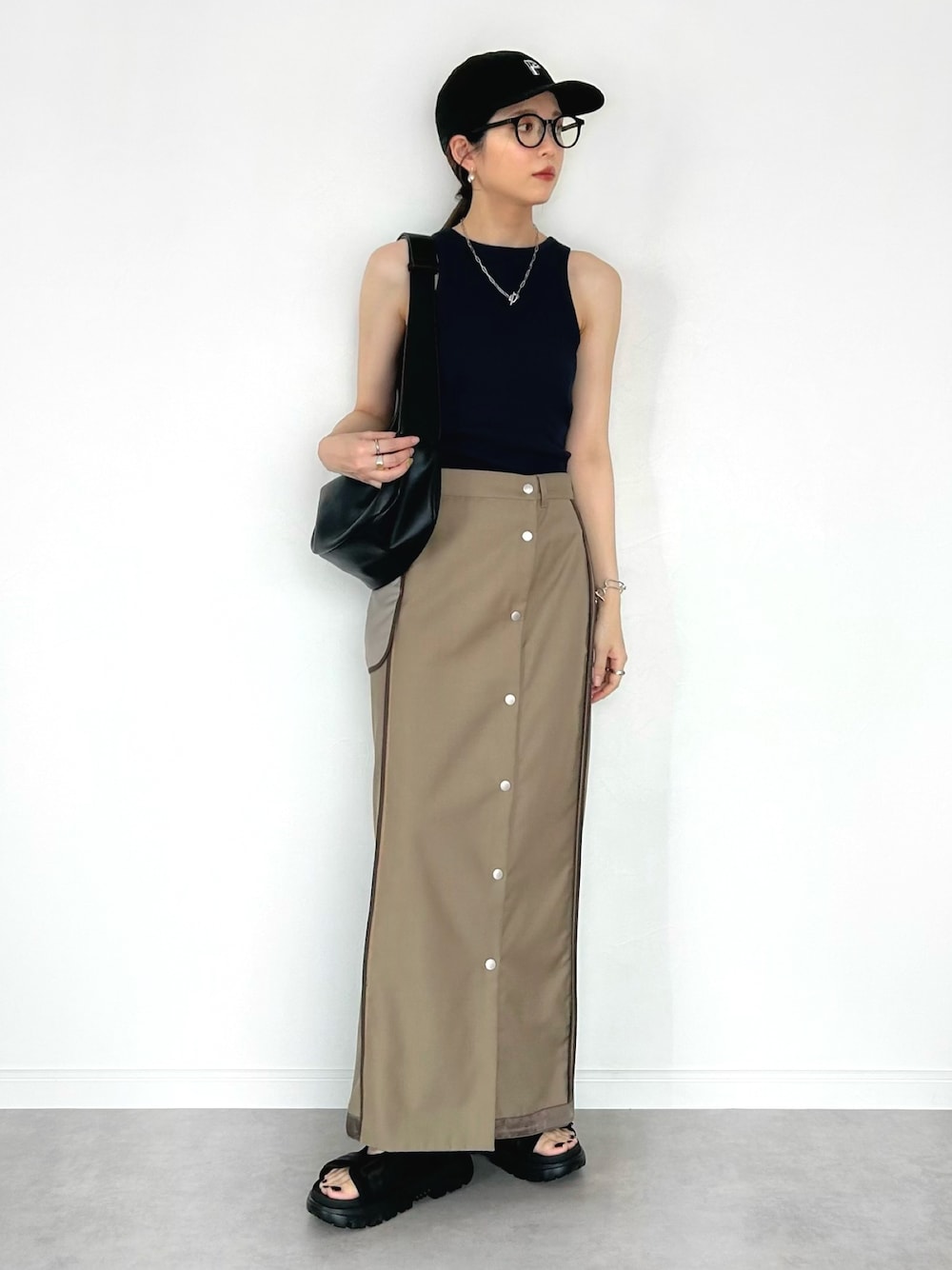 ご覧いただきありがとうございます♡ シンプルなネイビーのタンクトップに お気に入りのロングスカート🥰 キャップとスポサン合わせてカジュアル☘️ Instagram始めました! こちらもよろしくお願いします♡ Instagram→@okiri_021