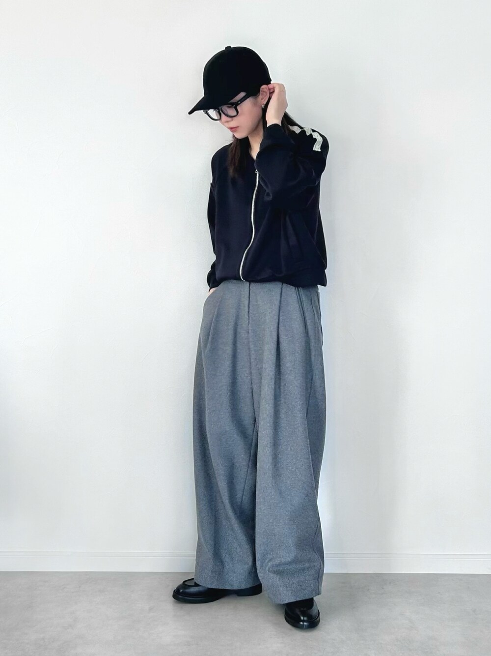 カジュアルなジャージをタックパンツやローファーと合わせてハンサムキレイめに🤓 ジャージは少しショート?丈なのとダブルジップだからバランス取りやすい🤗 ジャケットにも合わせたいな〜🖤