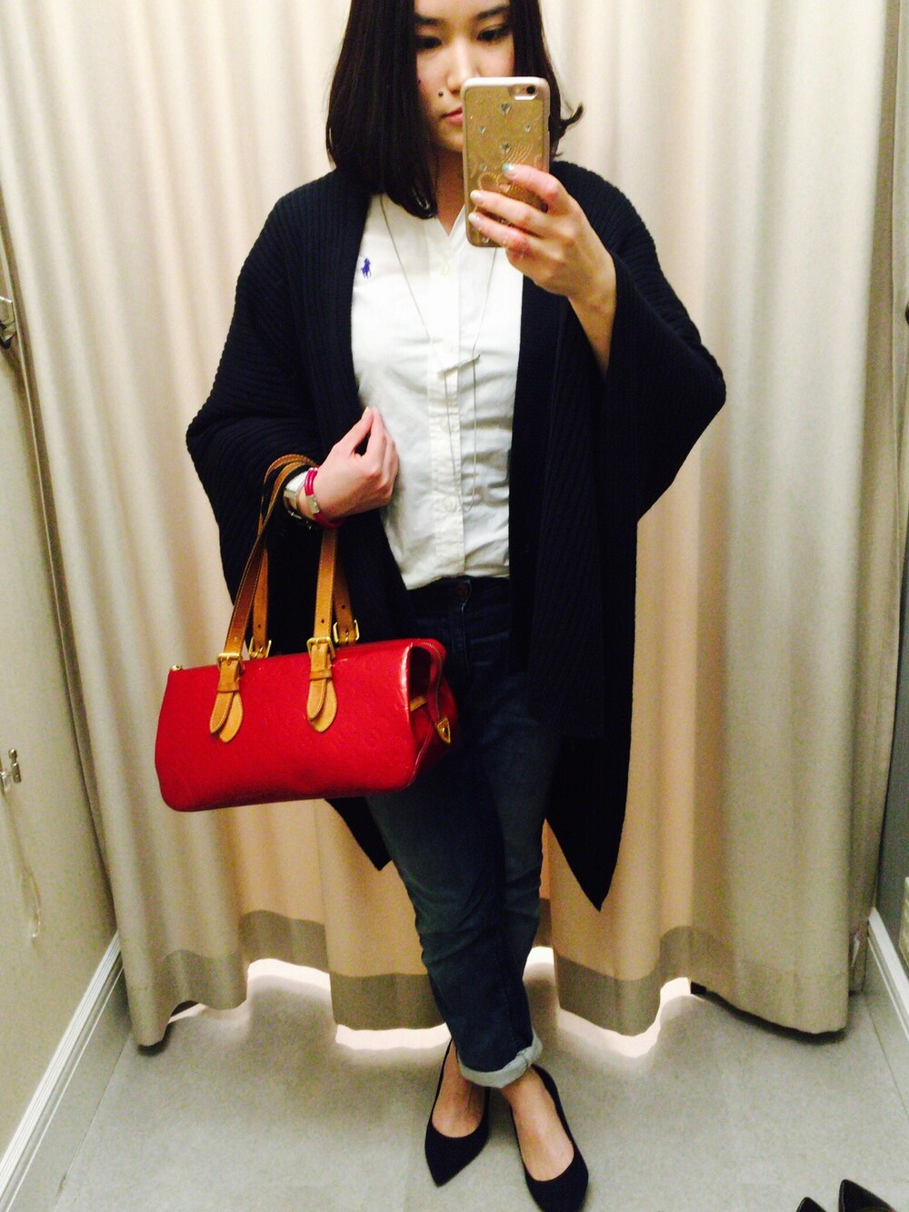 昼はラルフのシャツ、夜は寒いからUNIQLOのポンチョはおります😀 ネイビーが好きです❗️