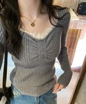 na(EC事業部)のニット/セーター「【華奢見え】レースVネックリブニットトップス」を使ったコーディネート