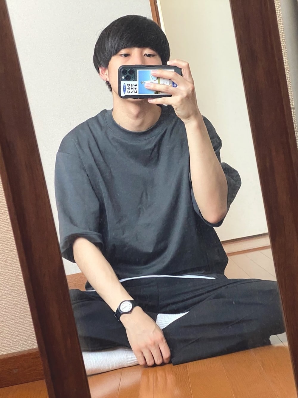何も無い日の休日コーデ トップスがダークグレー、パンツがブラックのダークトーンでシンプルコーデを組みました。上下が暗いと重い印象なので、レイヤードをして抜け感を出しました。