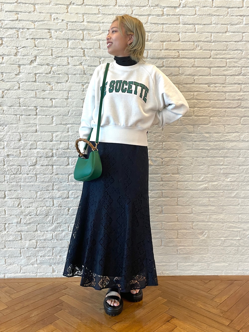 Haruka 159cm ロゴスウェットにレースのマーメイドスカートでフェミニンカジュアルコーデ!スウェットのロゴがグリーンなので、カラーを拾ってバッグもグリーンにし、統一感を出しました! 公式HPの検索🔍からご覧いただけます☑︎ shoes:C7124015 Instagram >> @haruka_ishizawa ぜひチェック・フォローお願いします♡